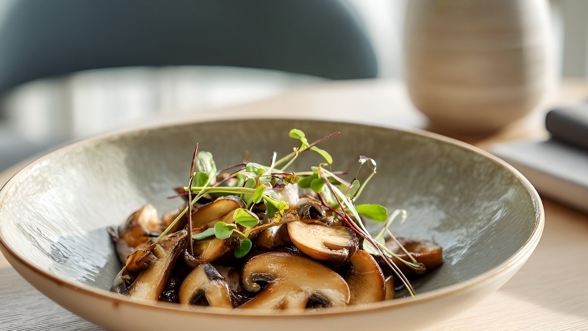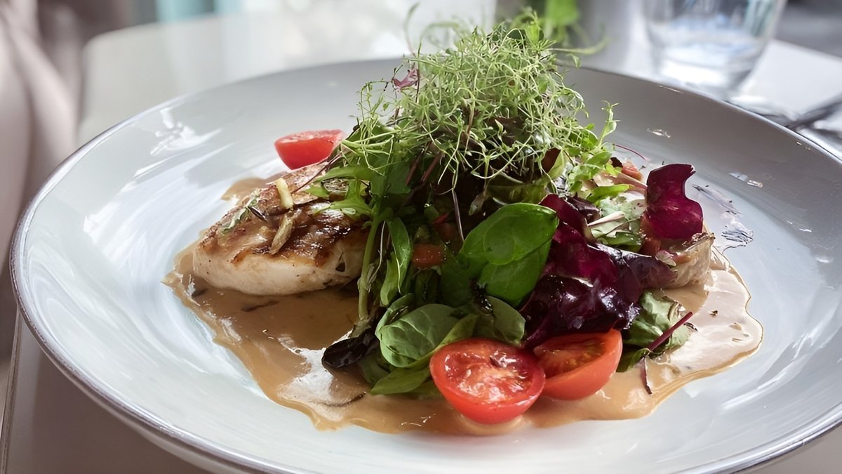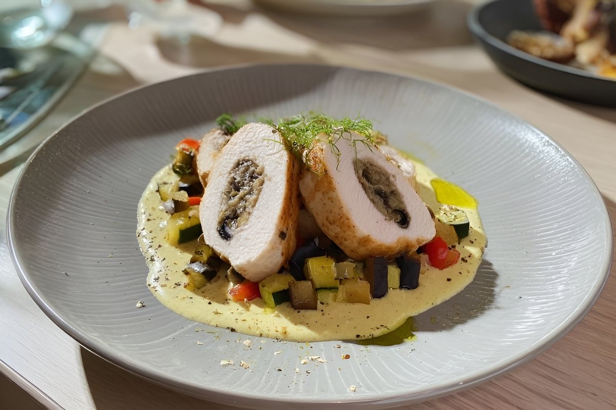 Нежный куриный рулет, фаршированный обжаренными шампиньонами и луком, подаётся с овощным соте и сочными помидорами черри. Лёгкая глазурь из мёда и зернистой горчицы придаёт блюду пикантную сладость, а тёртый пармезан завершает вкус