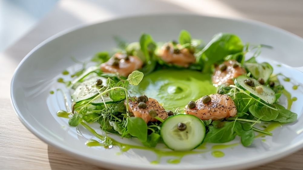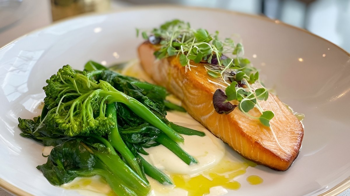 Нежный лосось в сливочном соусе с лимонными нотками, подается с зеленым гарниром из брокколи, шпината и стручковой фасоли, приправленный специями и микрозеленью