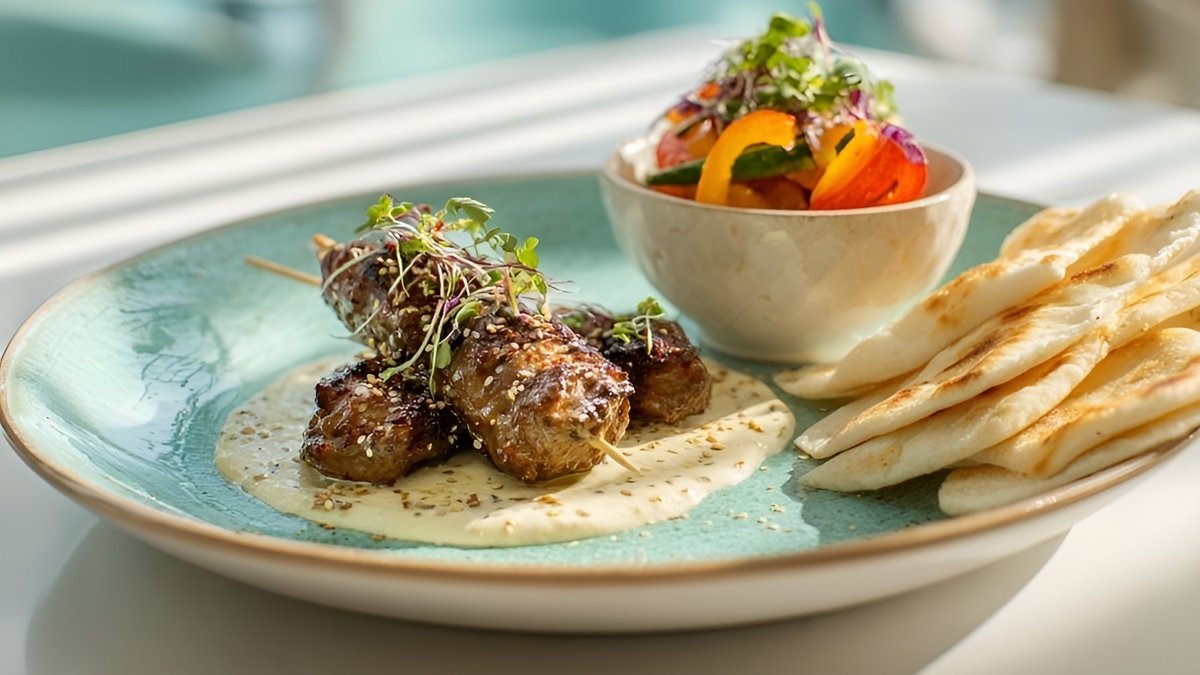 Шашлычки из куриного мяса, маринованные в соевом и рыбном соусе с кориандром, подаются с овощами и ароматным арахисовым соусом. Блюдо со сливочной текстурой и лёгкой пикантностью