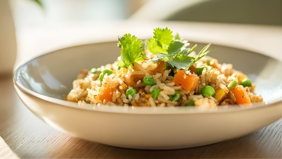 Обжаренный рис с кусочками говяжьей вырезки, овощами и ароматом имбиря и чеснока. Соусы терияки и сладкий чили придают блюду лёгкую сладость и пряную остринку