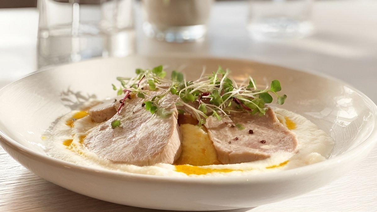 Говяжий язык, поданный с нежным картофельным пюре и сливочным соусом с лёгкой ноткой рыбного соуса. Мягкое, ароматное блюдо с деликатным вкусом