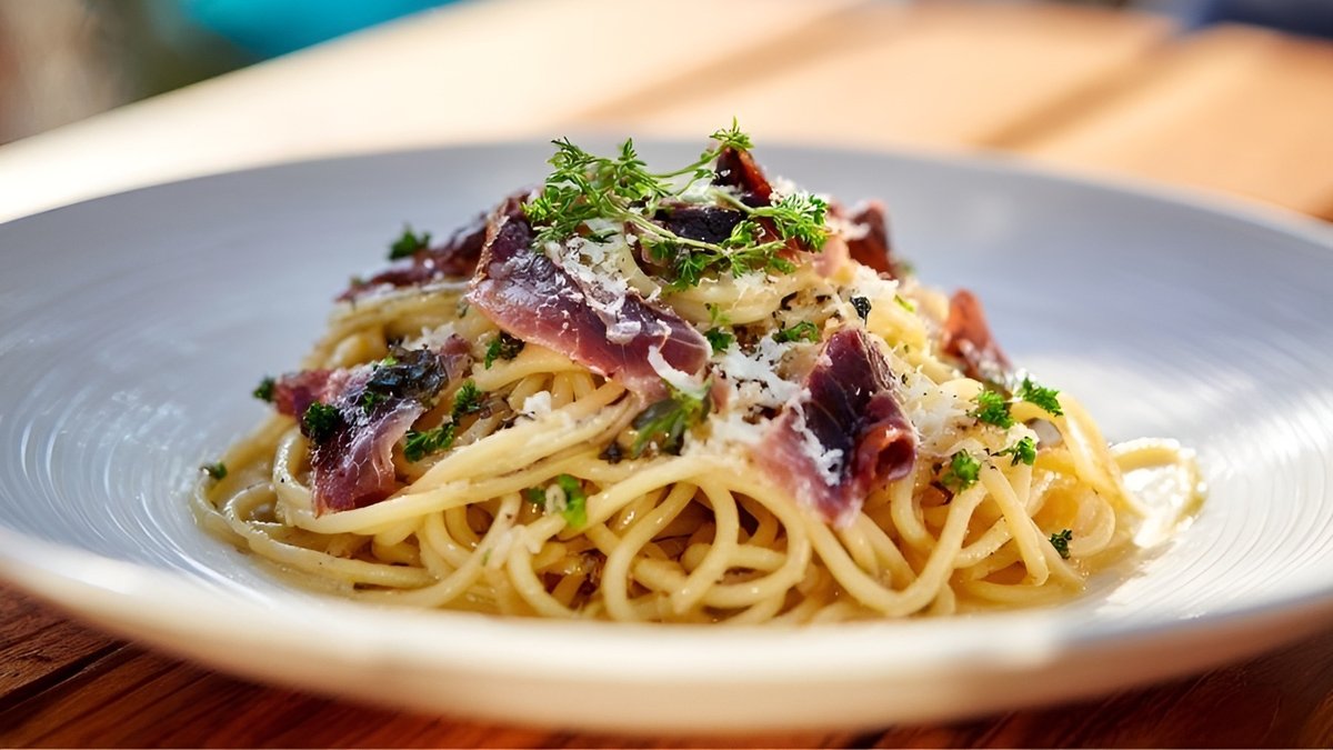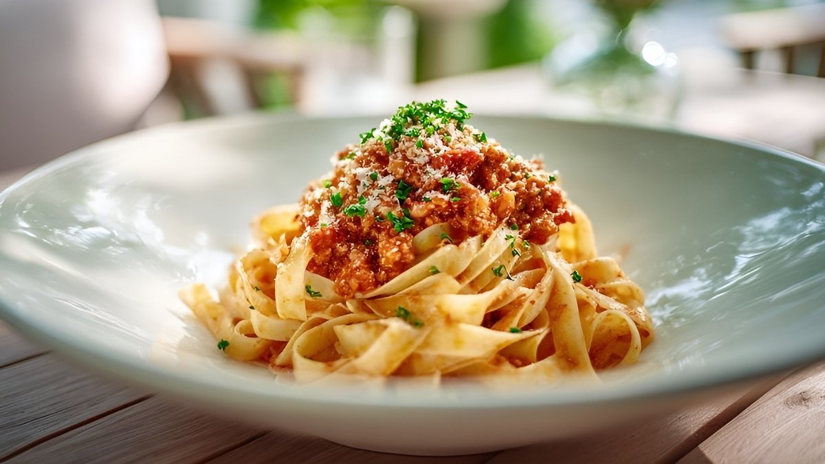 Паста с соусом из тушёных томатов, говядины, лука, моркови и специй. Классическое блюдо с глубоким мясным вкусом и нотками итальянских трав