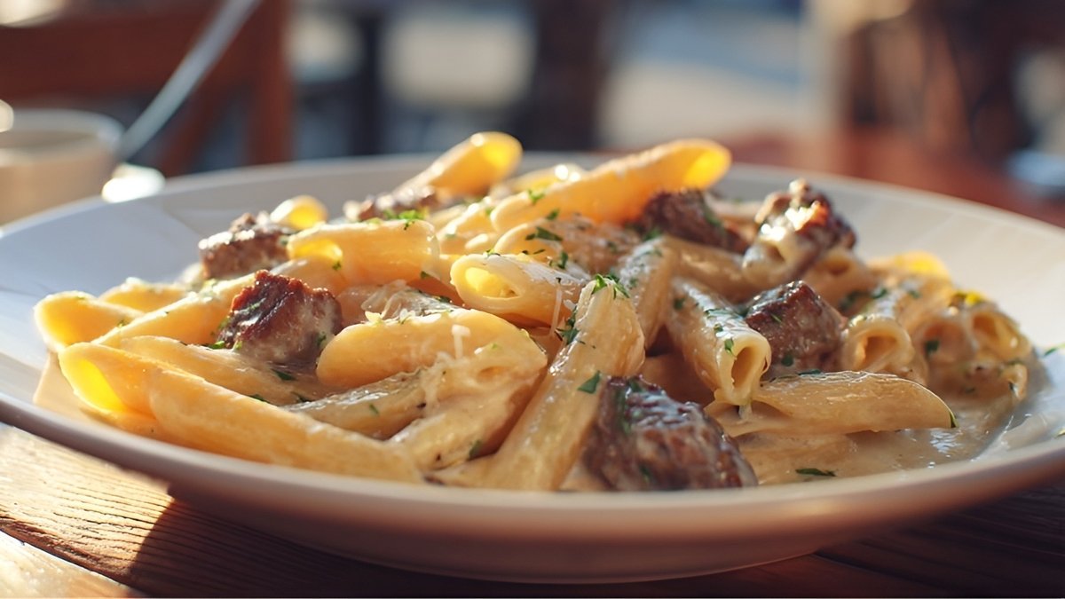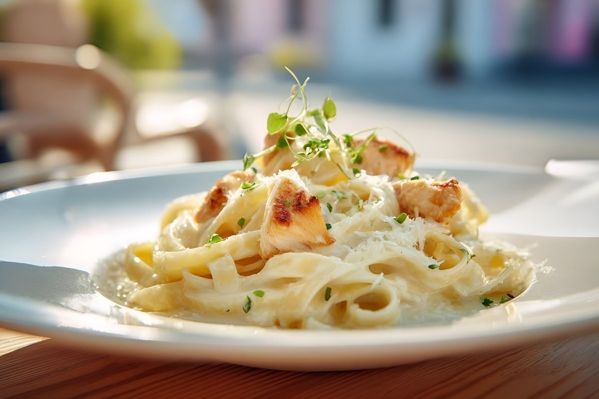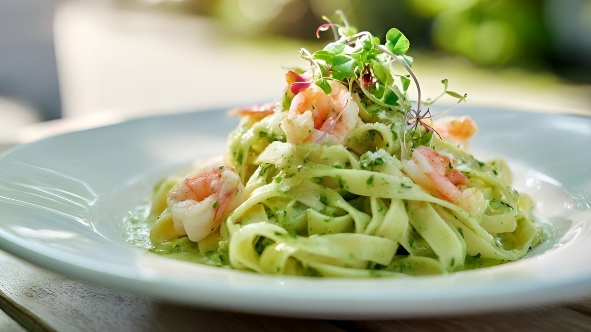 Паста в сливочном соусе с морепродуктами, пармезаном и лёгким ароматом чеснока. Нежное блюдо с мягким вкусом и кремовой текстурой