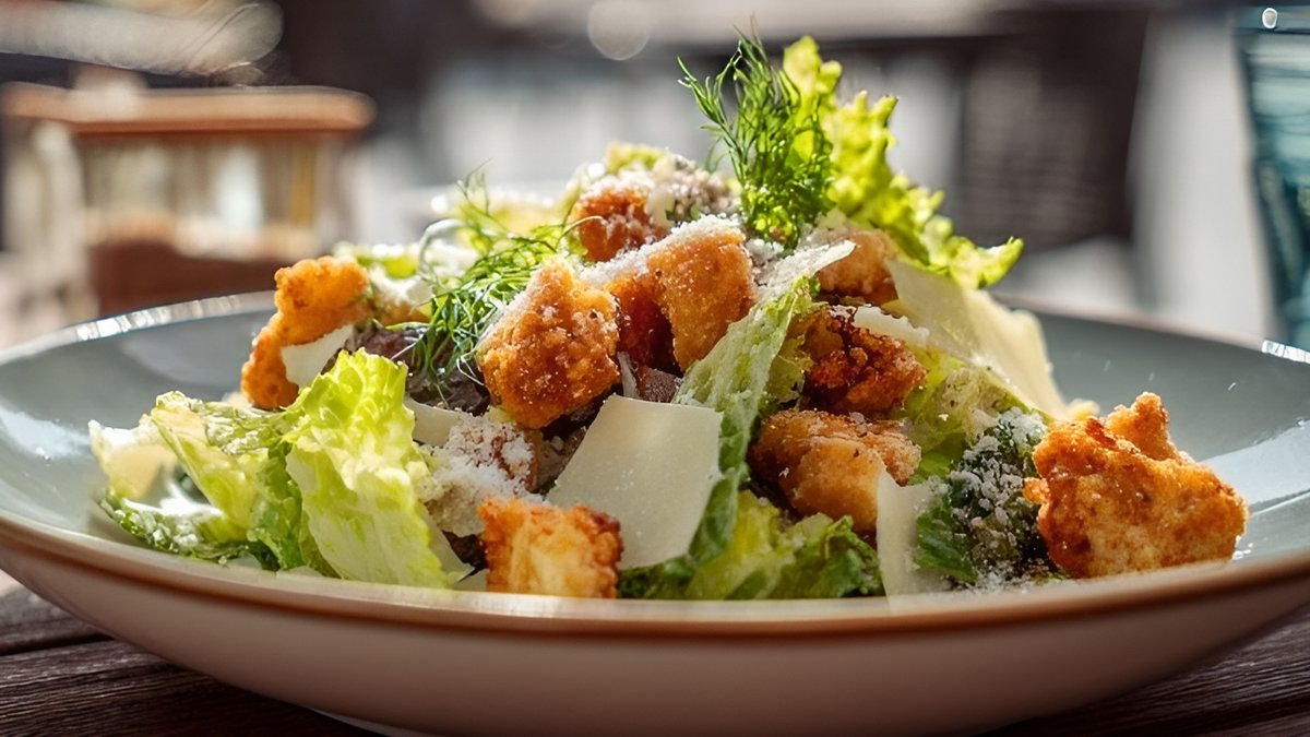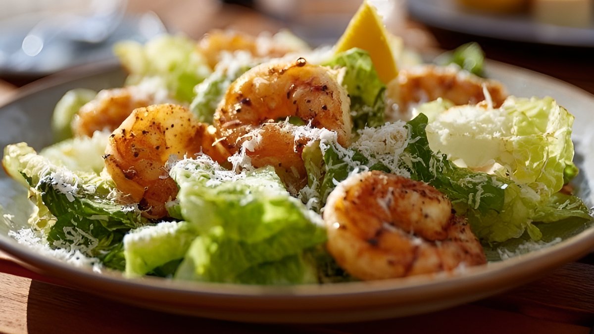 Салат айсберг, креветки, помидоры черри и крутоны под классическим соусом «Цезарь», щедро посыпанные пармезаном.