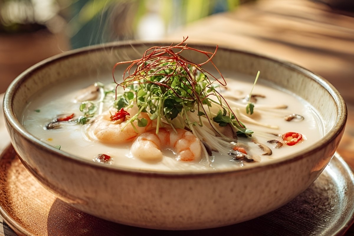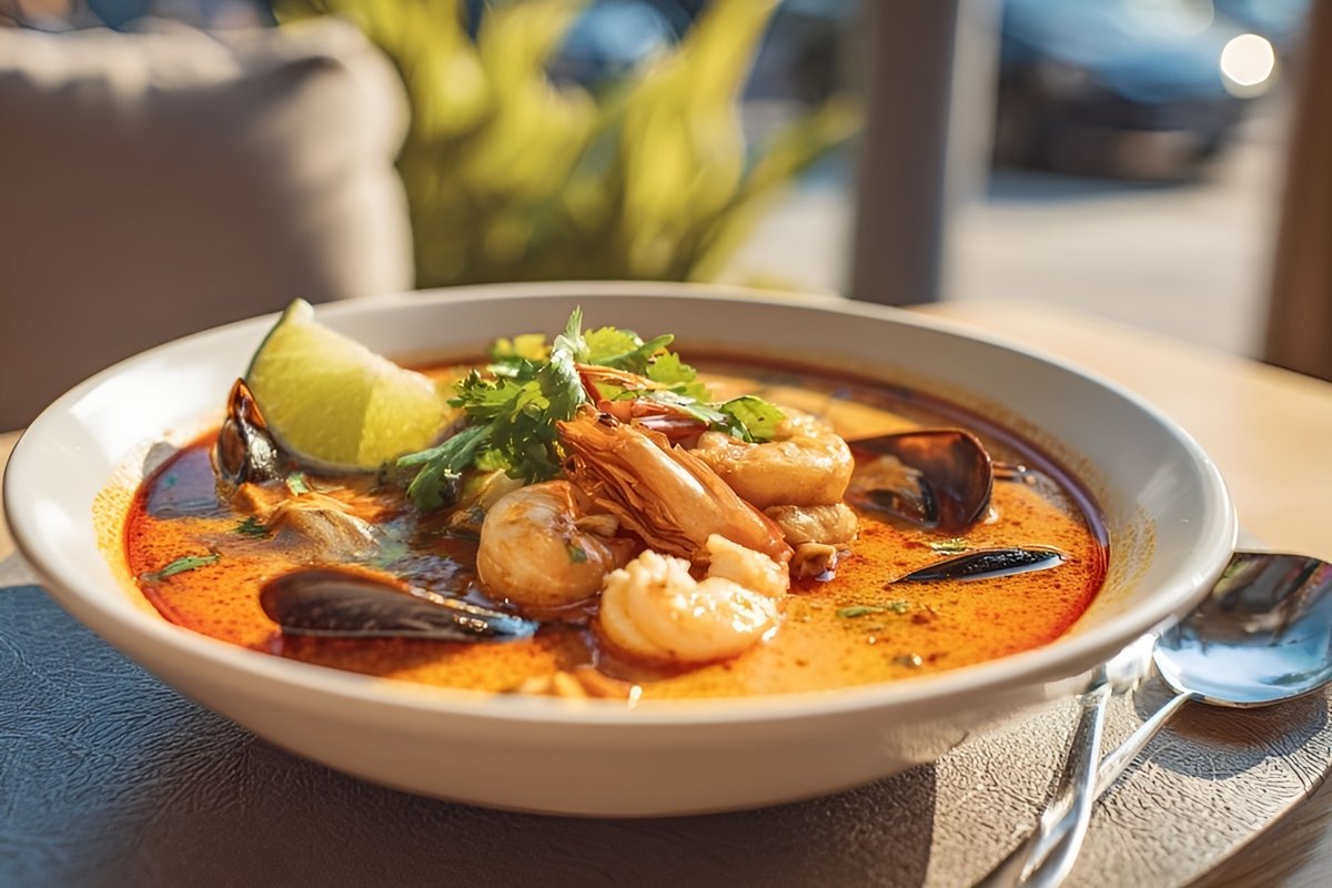 Пряный тайский суп на кокосовом бульоне с креветками, кальмарами и грибами шиитаке. Подаётся с рисом, обладает насыщенным вкусом с лёгкой остротой и кисло-сладкими нотами.