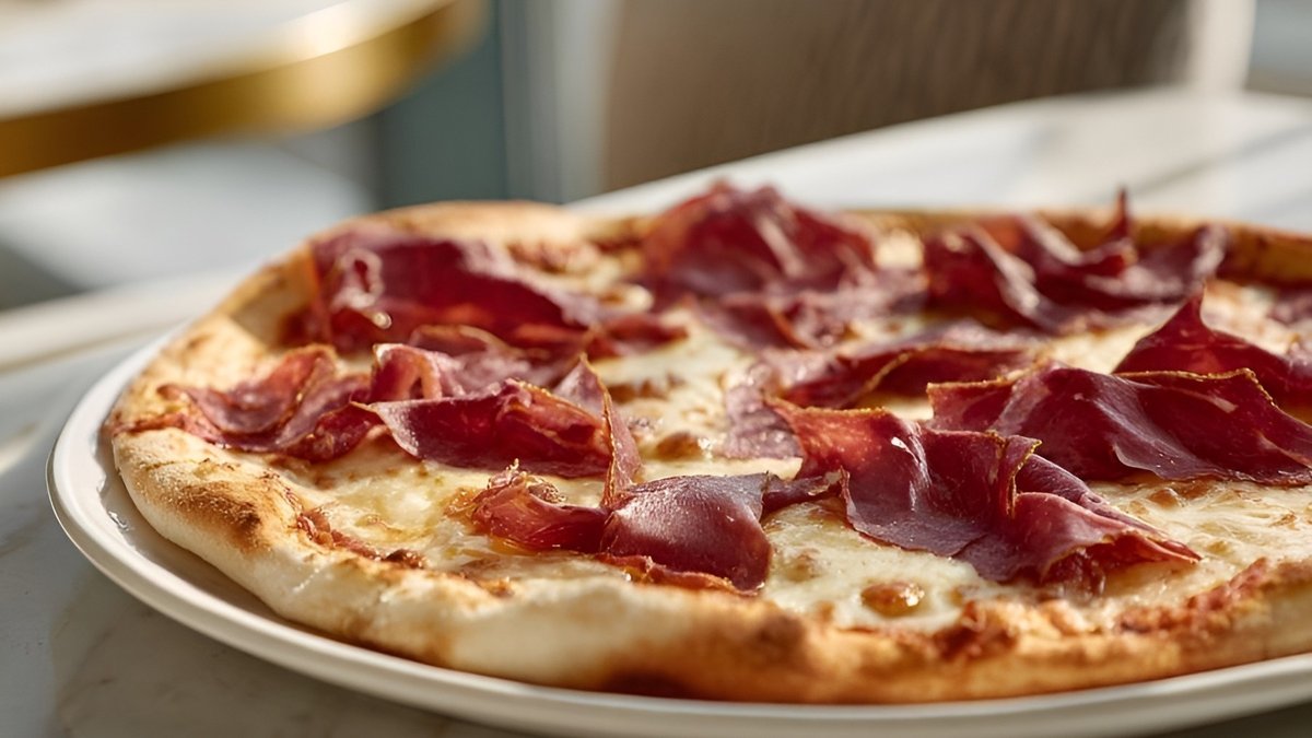 Румяная кесадилья с хрустящим беконом, сочными шампиньонами, луком и томатами под тянущейся моцареллой, со сметаной и ноткой сливочного масла для мягкого насыщенного вкуса