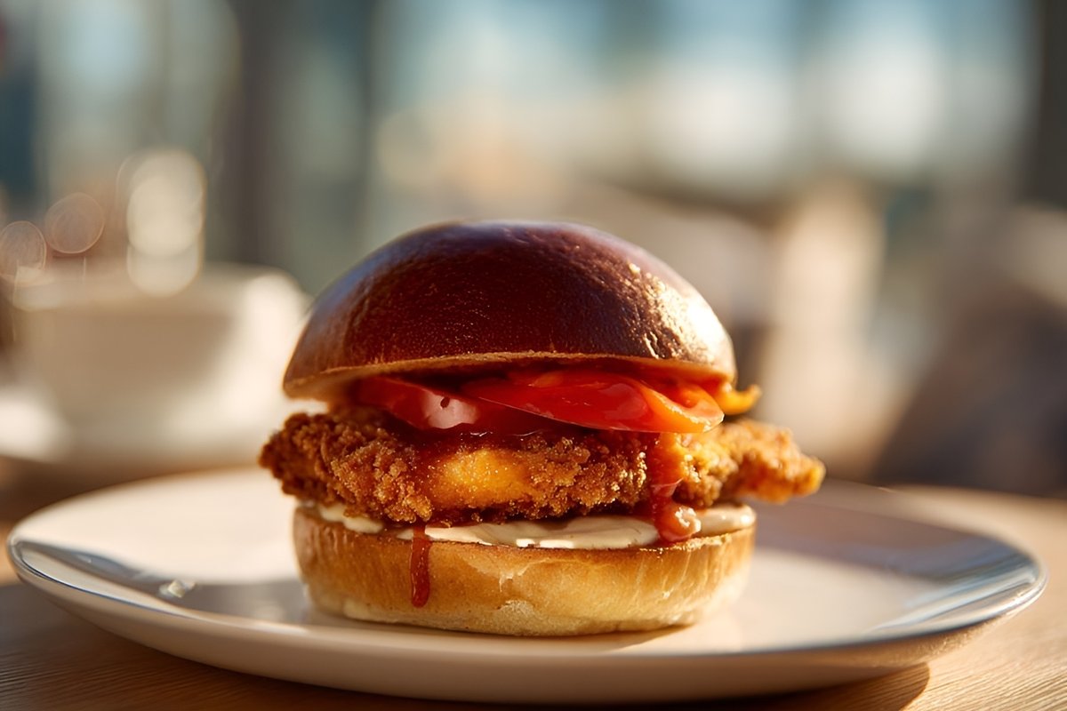 Хрустящий куриный шницель в мягкой булочке с соусом, помидорами и листьями салата.
