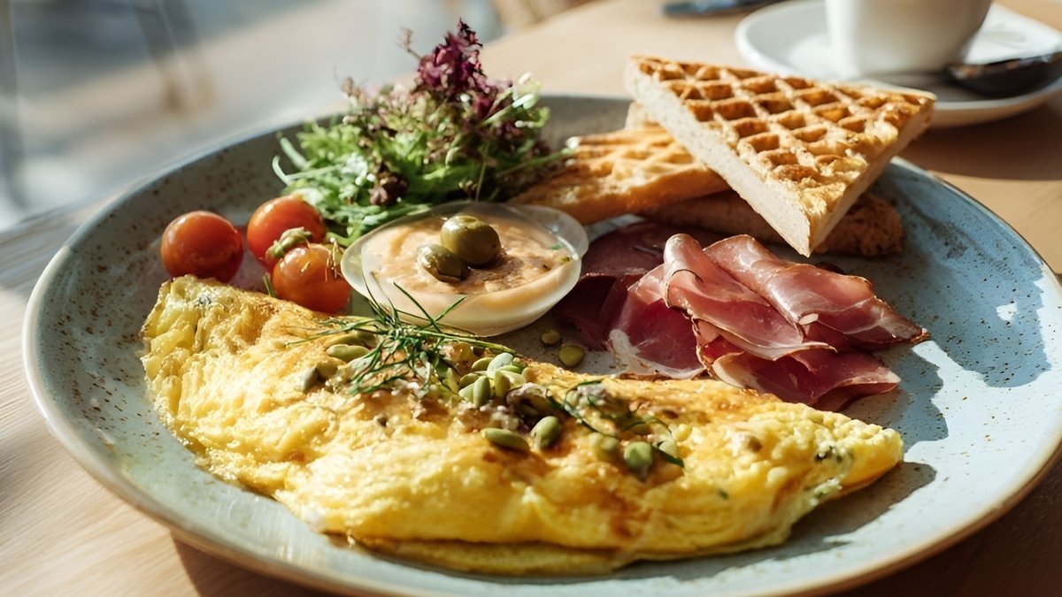 Хрустящая вафельная основа с тёплым жареным халуми — снаружи румяный, внутри нежный и упруго-сливочный. Сочная свежая зелень подчёркивает солоноватый вкус сыра.