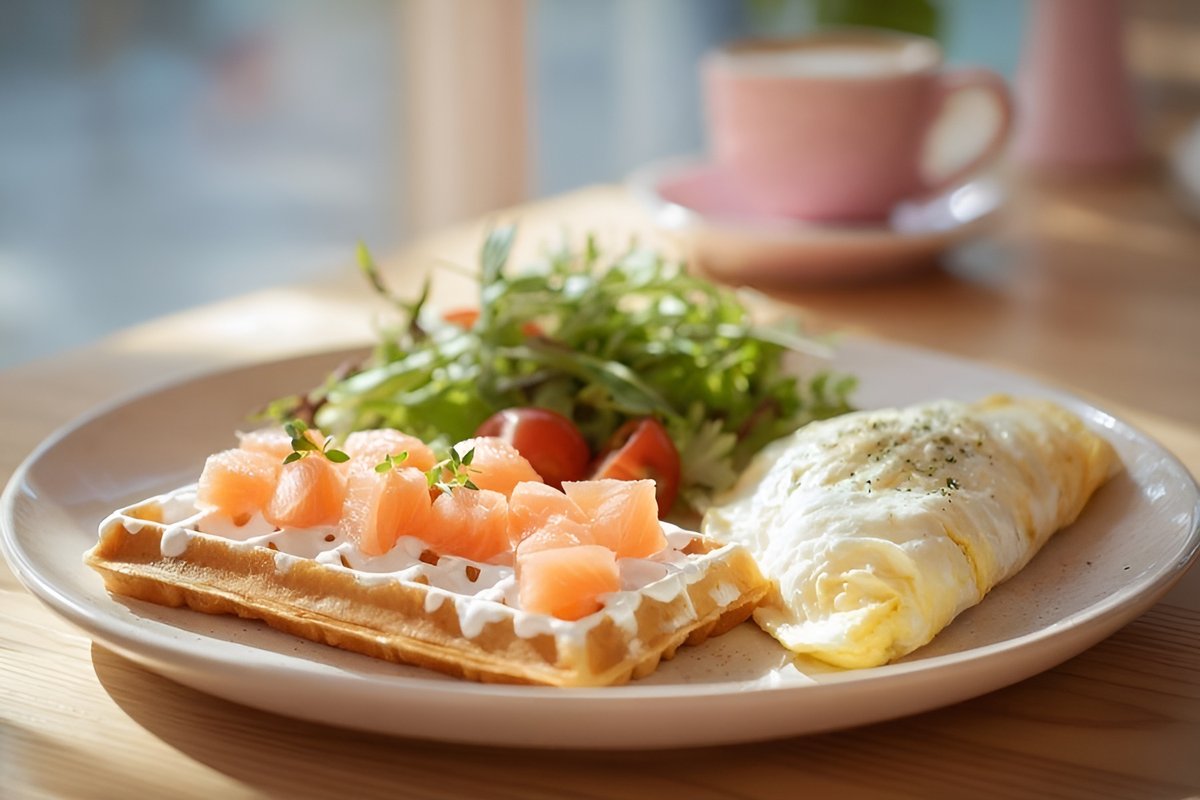 Бельгийская вафля с воздушным тестом, нежной рикоттой и ароматным лососем гравлакс. В качестве гарнира - свежий микс зелени. Завершает композицию яркий цитронет с апельсином, мёдом и бальзамиком, придающий блюду чистый цитрусово-сливочный вкус