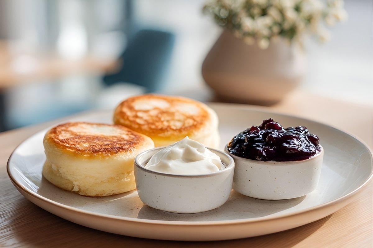 Сырники из творога, поданные с черникой и сметаной - нежные, слегка сладкие и домашние