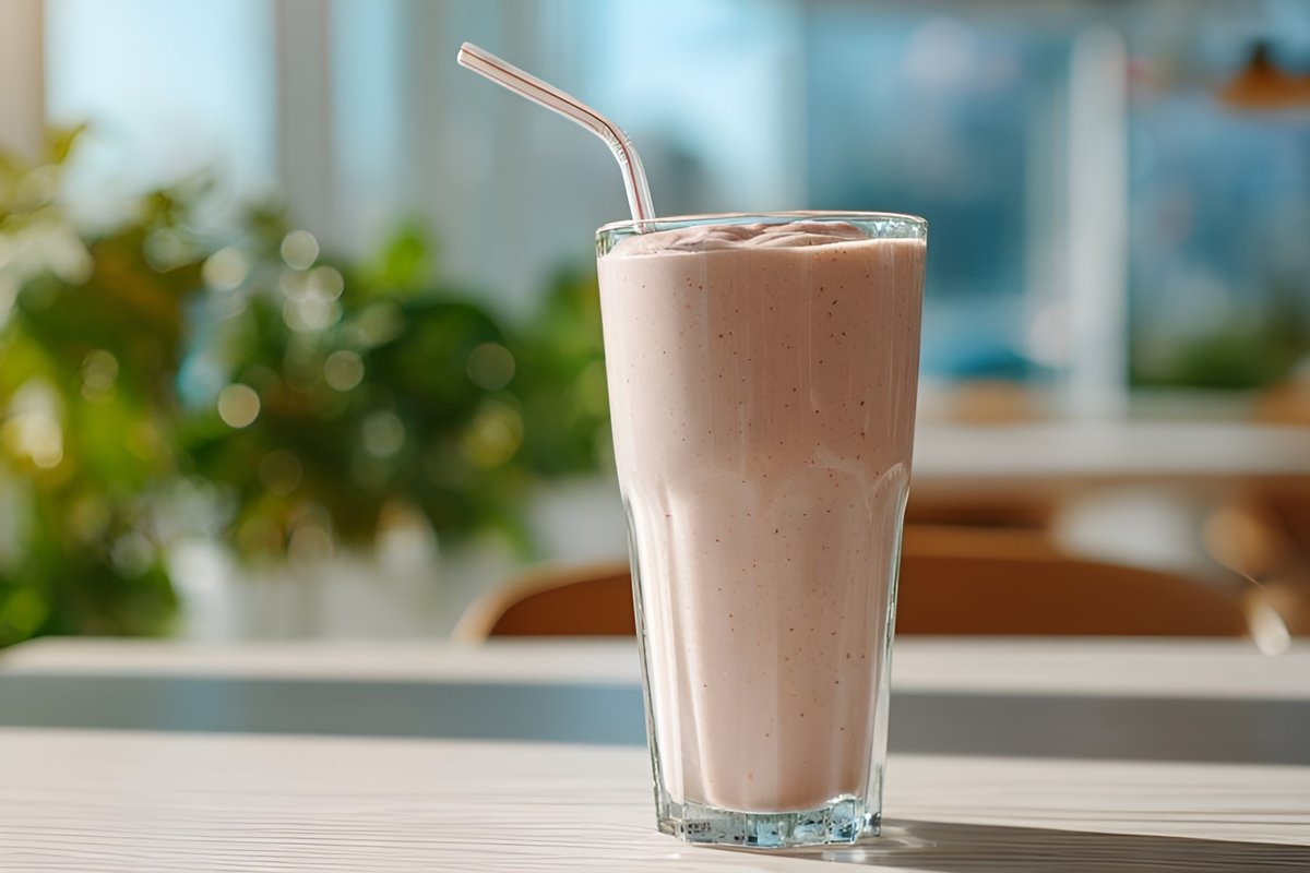 Нежный густой напиток из спелого банана и сладкой клубники, взбитых до кремовой текстуры
