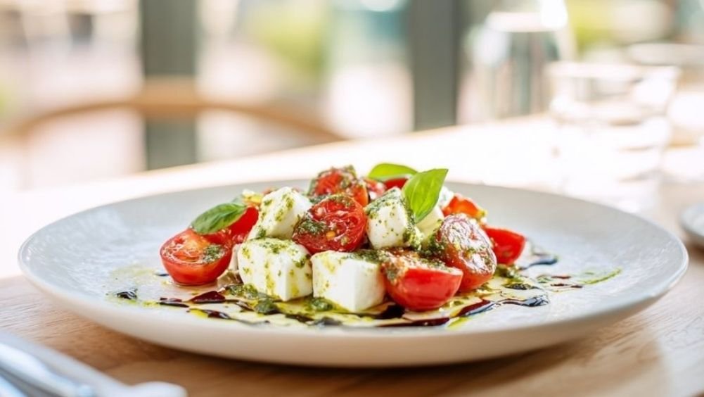 Вафельная брускетта с печёным перцем и сочными томатами, слегка карамелизированными в духовке. Лёгкая кислинка бальзамика и травы дают баланс и глубину вкуса