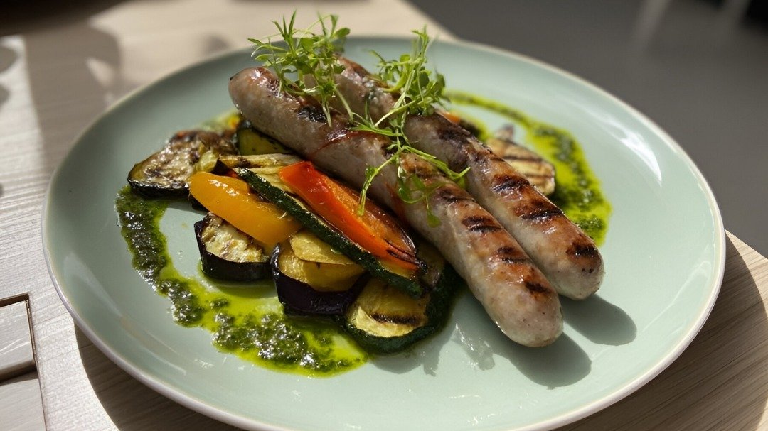 Колбаски, обжаренные до румяной корочки и поданные с овощами - морковью, баклажанами и цукини. Соус чимичурри придаёт блюду свежий, пряный вкус с лёгкой остринкой