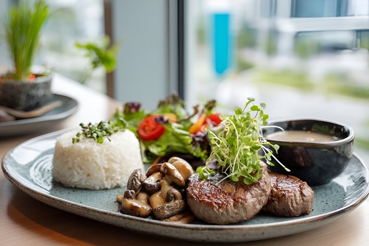 Сочные медальоны из говядины, обжаренные с чесноком, тимьяном и горчицей, под рыбным соусом и сои. Подаются с рассыпчатым рисом, шампиньонами и салатом из свежих томатов и зелени. Блюдо с насыщенным вкусом и лёгкой пряной ноткой