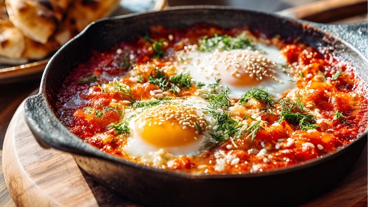Яйца, запечённые в пряном соусе из томатов, лука, чеснока и специй. Лёгкая остринка соуса шрирача, сливочность и свежая зелень создают насыщенный вкус