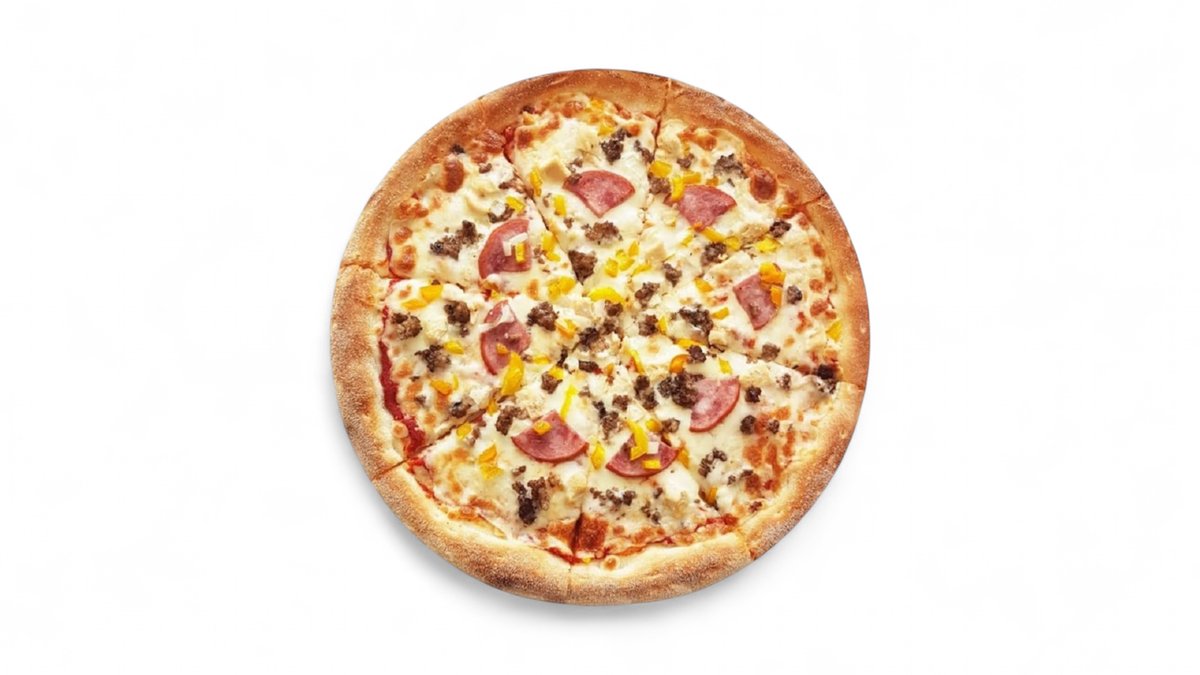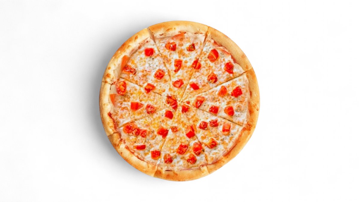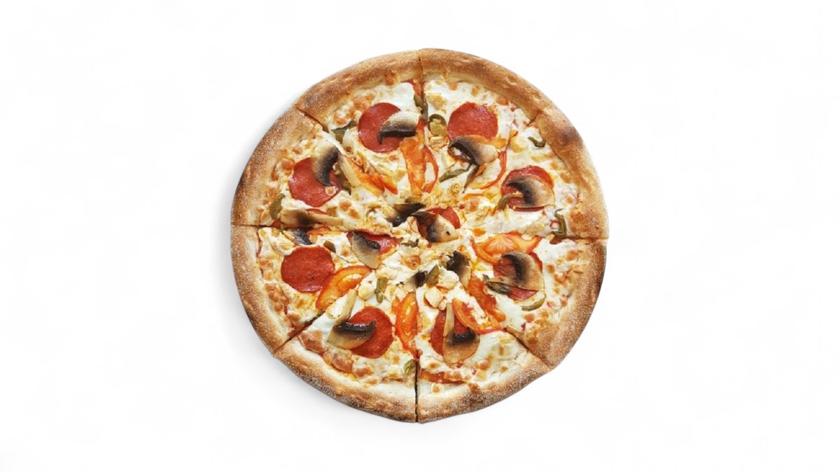 Тесто, соус красный, сыр Моцарелла, пепперони, шампиньоны, томат, курица, перец Халапеньо