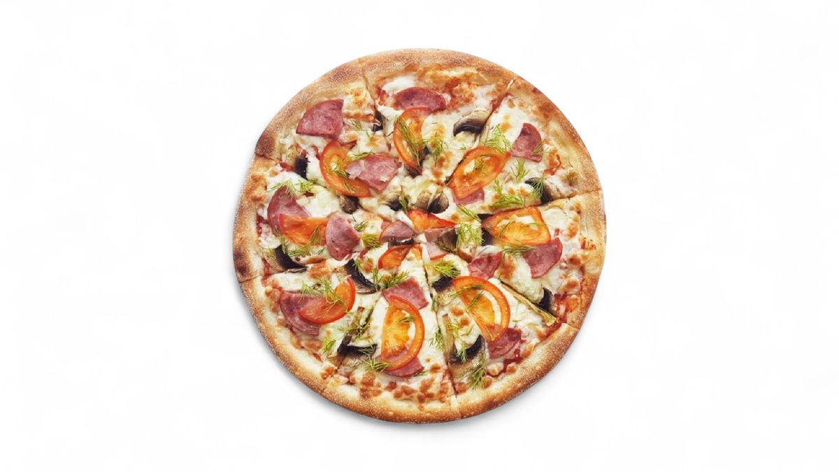 Тесто , соус красный, сыр Моцарелла, ветчина, помидор, лук репчатый, укроп, грибы шампиньоны