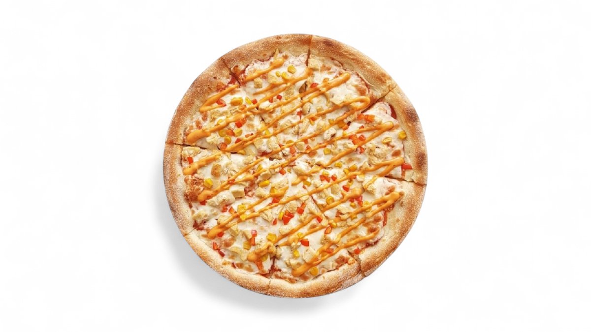 Тесто, соус красный, сыр Моцарелла, курица, кукуруза, паприка, соус 1000 островов