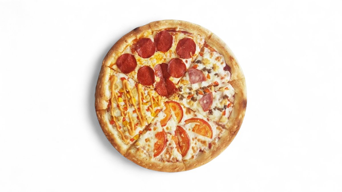 1/4 «Куриная», 1/4 «Пепперони», 1/4 «Мясная», 1/4 «Маргарита»