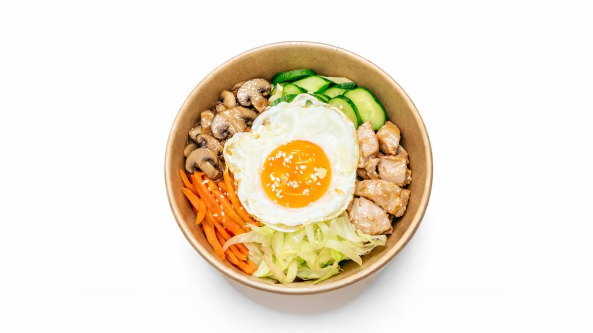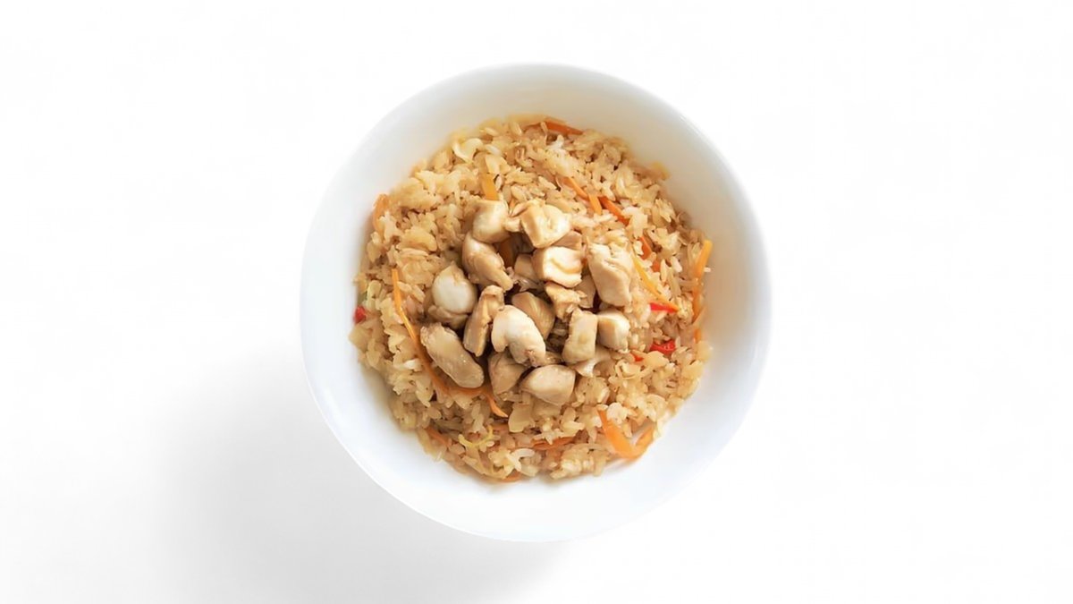 Рис в сочетании с сочной курицей, грибами, овощами и глазуньей
