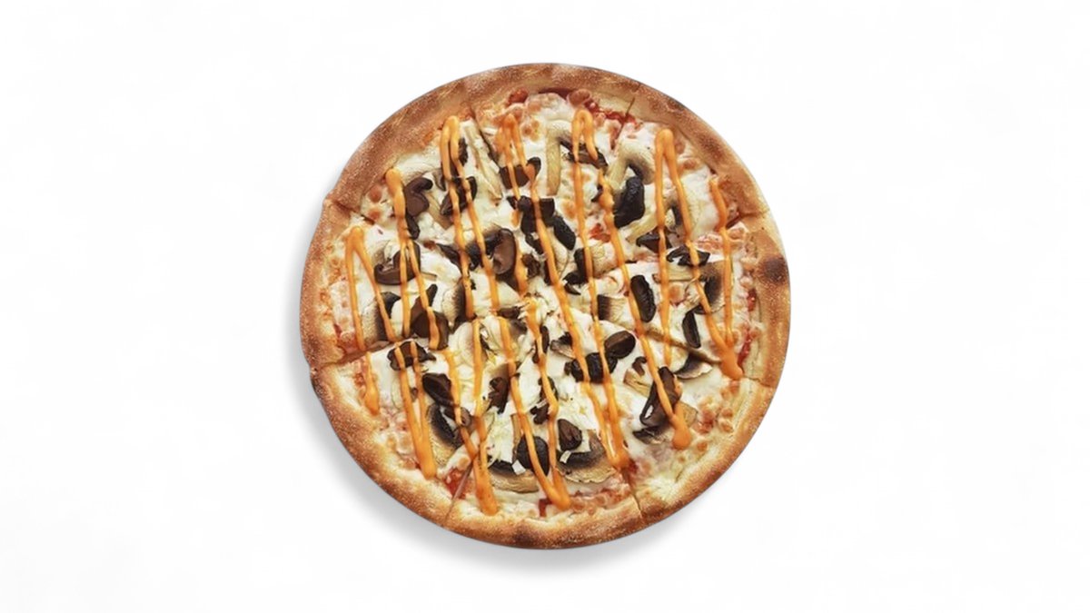 тесто, сыр Моцарелла, красный соус, шампиньоны, шиитаке, соус 1000 островов