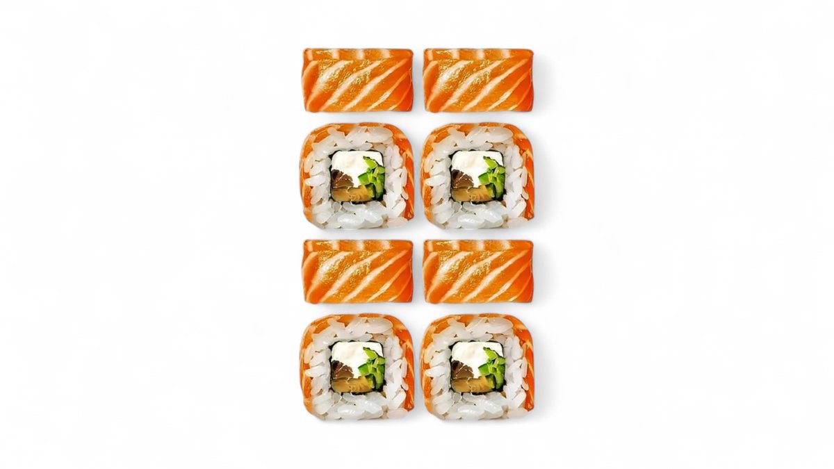 Ролл Калифорния с лососем в сет, Ролл огурец в сет, Ролл лосось в сет, Ролл Канада в сет, Ролл Идзуми в сет, Ролл Ямато в сет, Ролл Нежный краб в сет, Лосось суши, Угорь суши