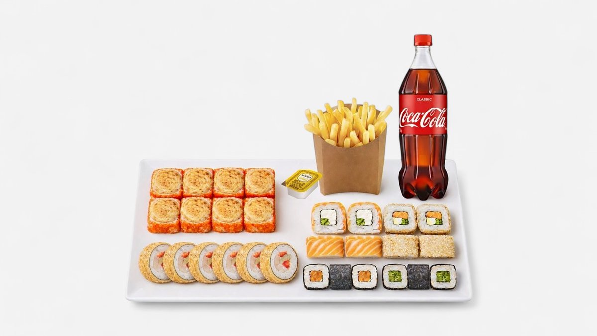 Сет Первый, Мираж горячий ролл, Жара, Картофель Фри, Соус сырный, Coca Cola 1 л.