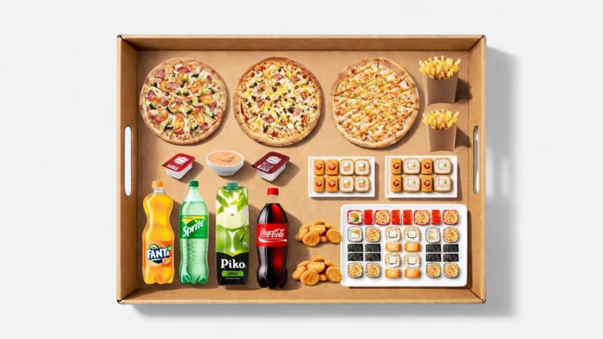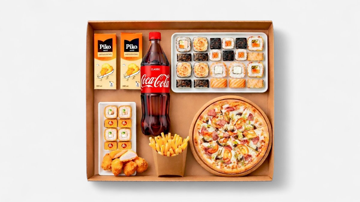 Сет Подсолнух, соус Кетчуп, Спайси соус, Соус Сырный, Соус Барбекю, Sprite 1 л., Fanta 1л., Coca - Cola 1 л., нагетсы - 2 шт., картофель фри - 2 шт., пицца Сочный цыпленок, Мясная пицца, Европейская пицца, Салмон криспи, Чикен криспи, Пико 1л.