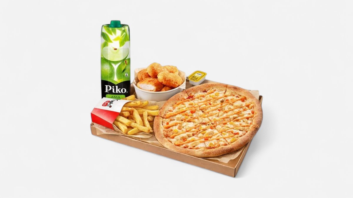 Пицца "Сочный цыпленок", Картофель фри, Соус сырный, Нагетсы, Пико 1л