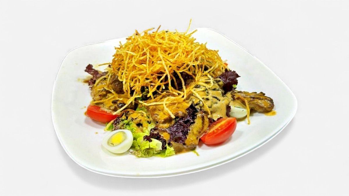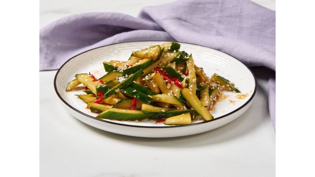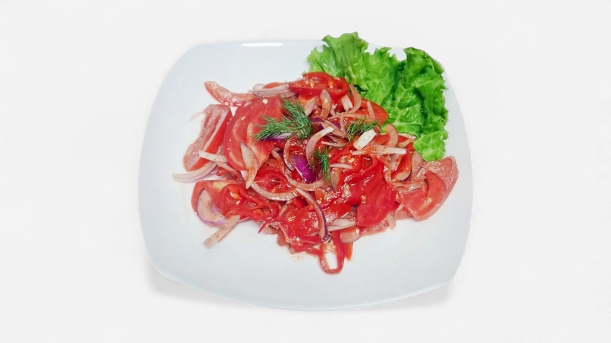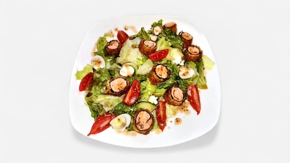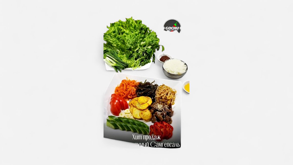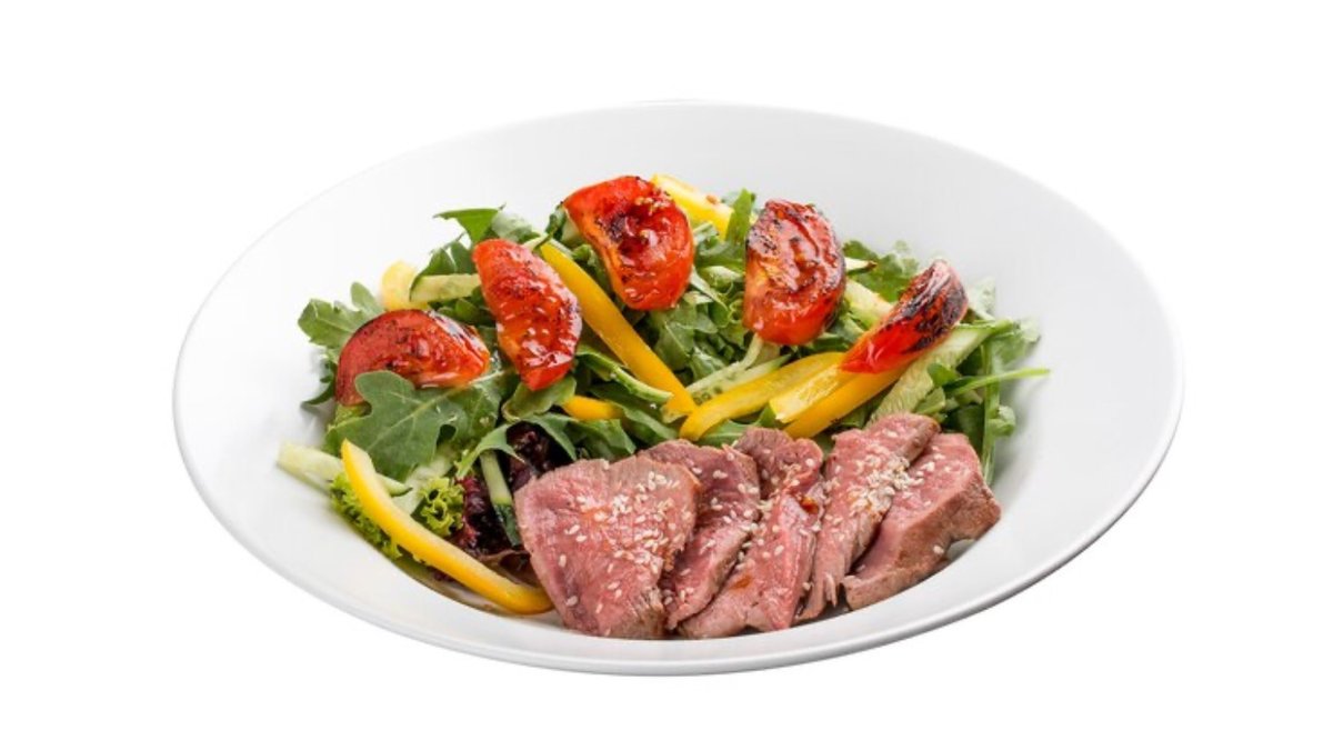говядина, помидоры, огурцы, капуста, яичные блины, кунжут