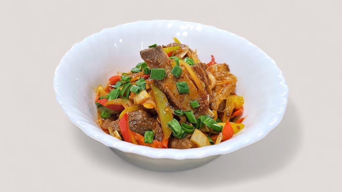 рыба, дунганский перец, лук, специи, зелень