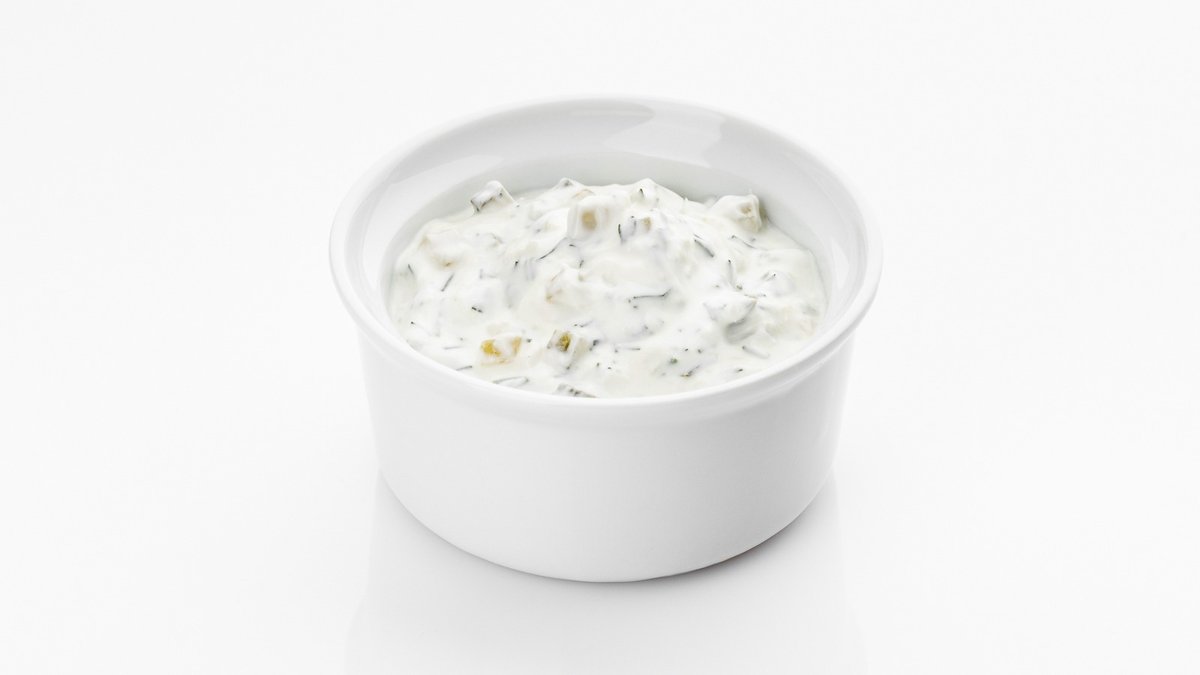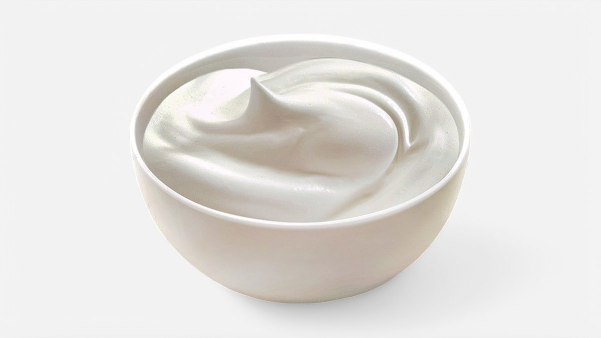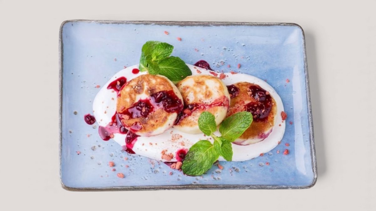 Творог, яйцо, мука, сметана, мята, сублимированная клубника и фирменный сироп.