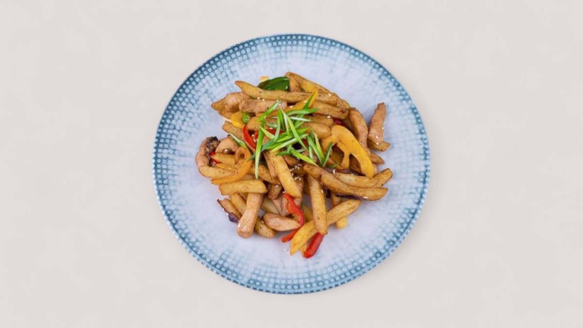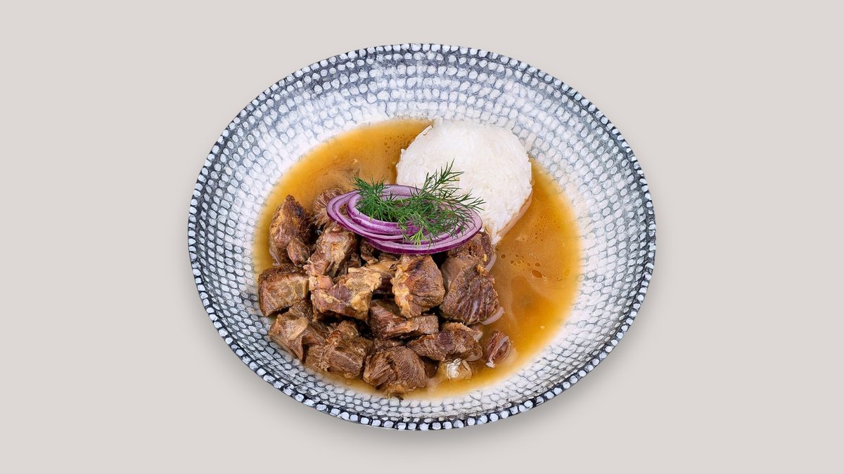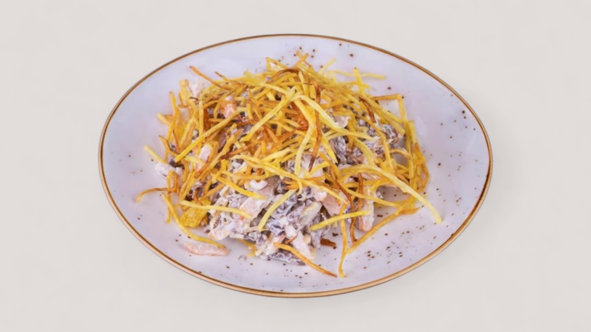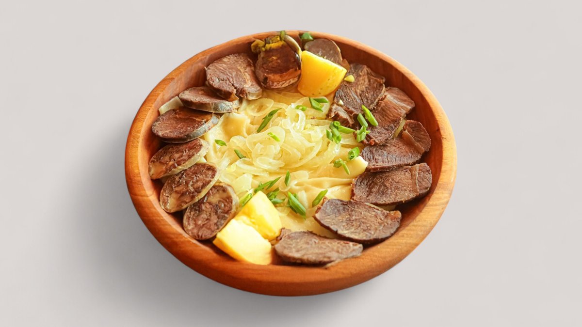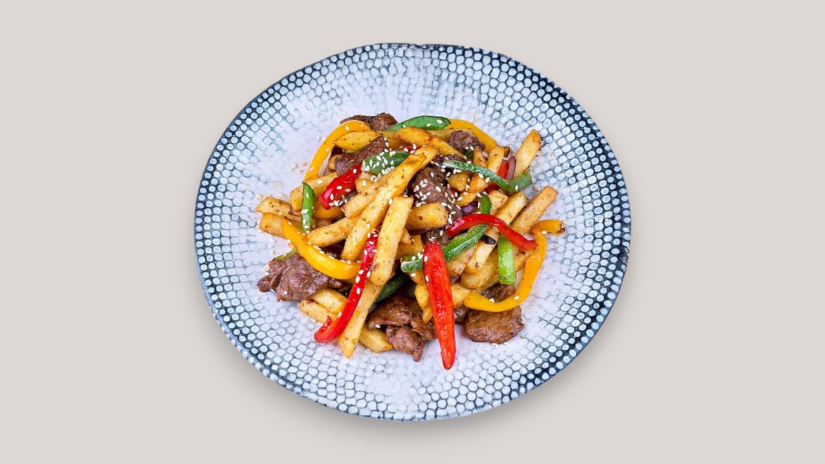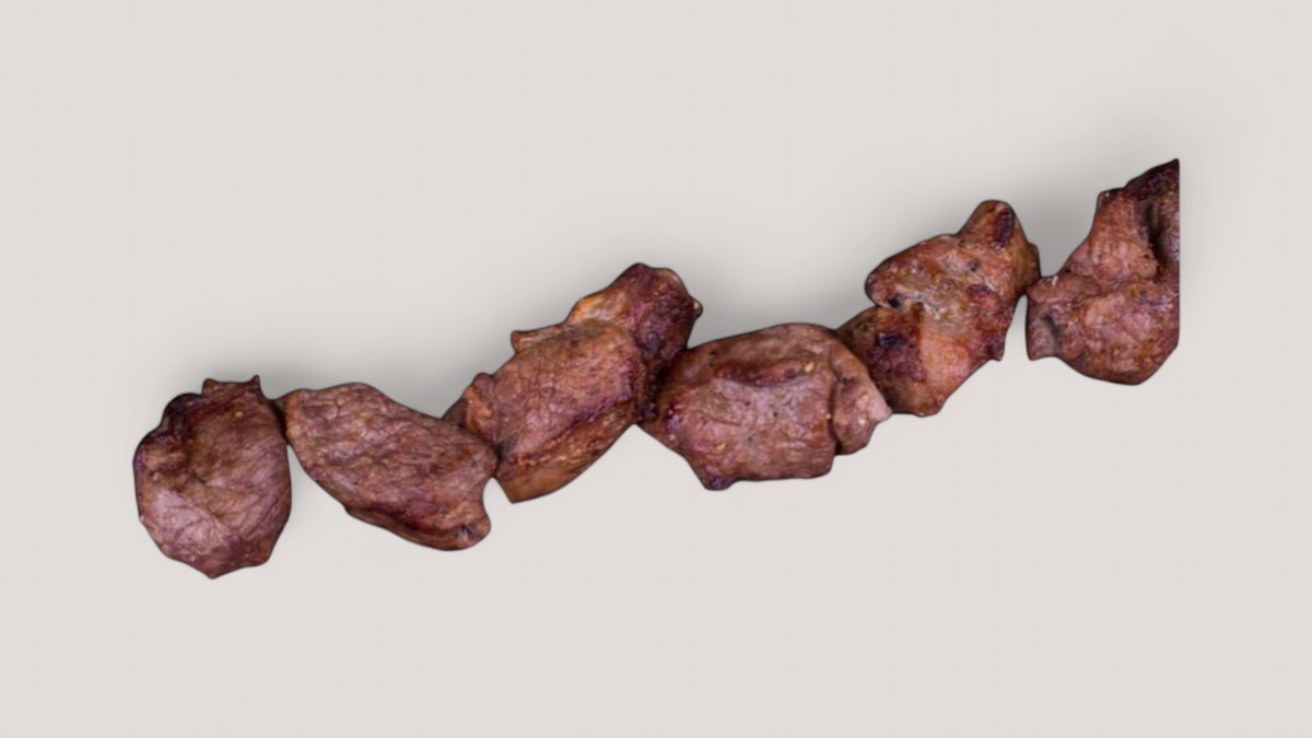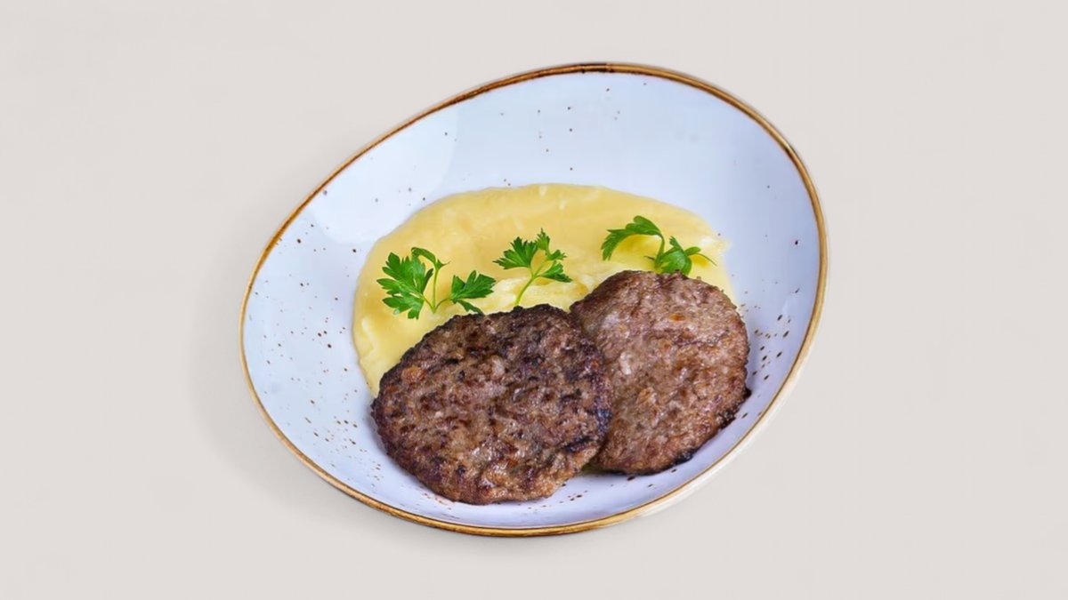 Нежная телятина, отборная конина и сочная курочка, картофель пай, заправлен соусом.