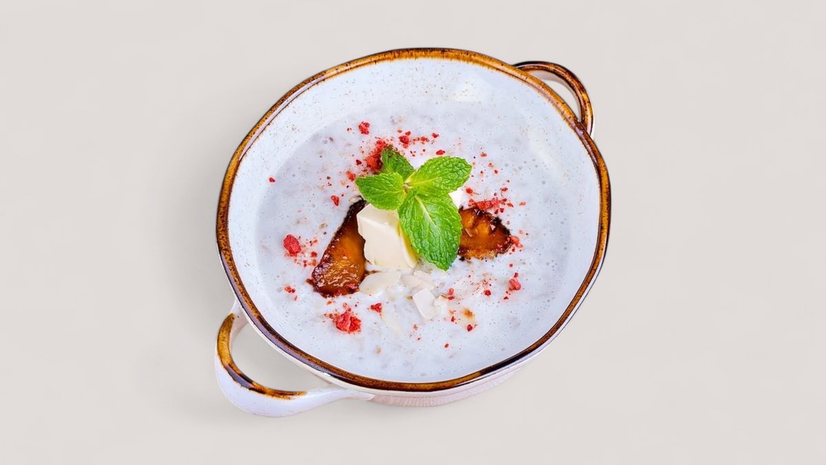 Рисовая каша на молоке со сливками, сливочным маслом, сахаром и солью, с клубникой, бананом, миндальными слайсами и мятой.