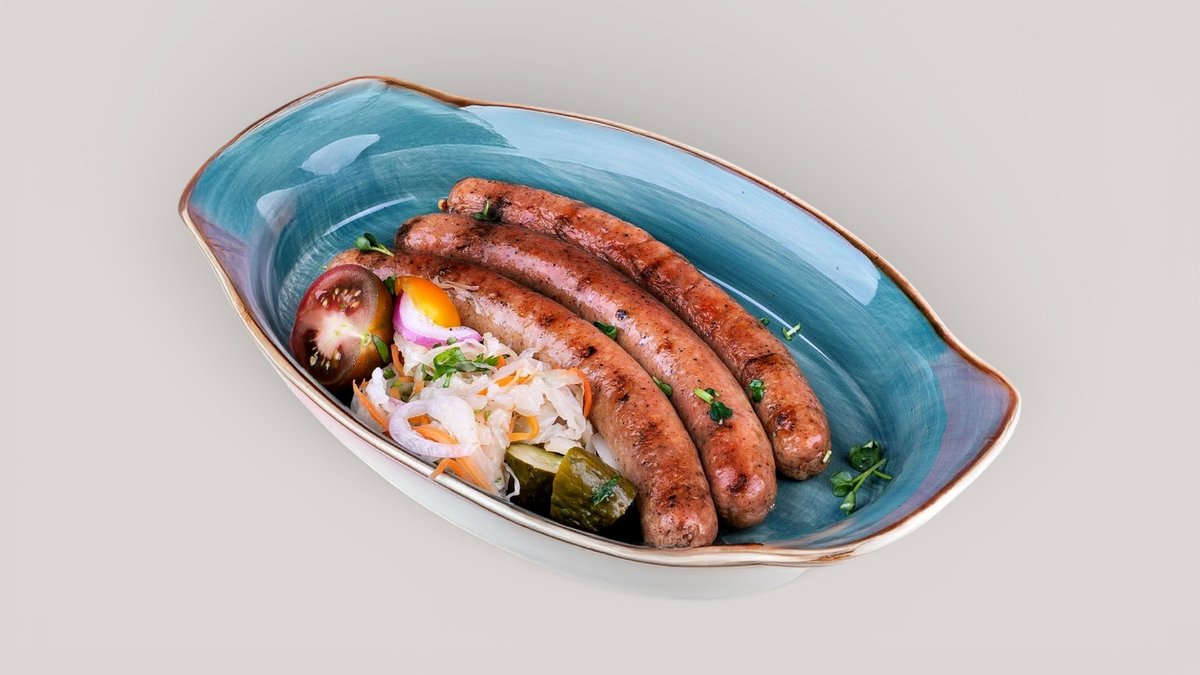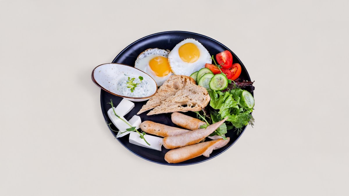 Микс салата, сыр, помидоры черри, огурцы, чиабатта, микрозелень, сливочное масло, колбаски на выбор.