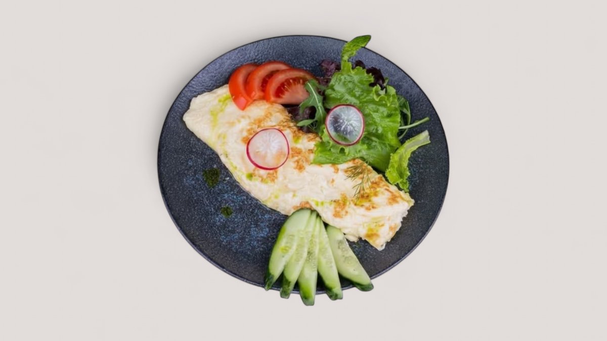 Яйца, конина, шампиньоны, лук, растительное масло, сливки, соль, чёрный перец, зелень, микс салата, лимон, соус свит-чили, помидоры черри.