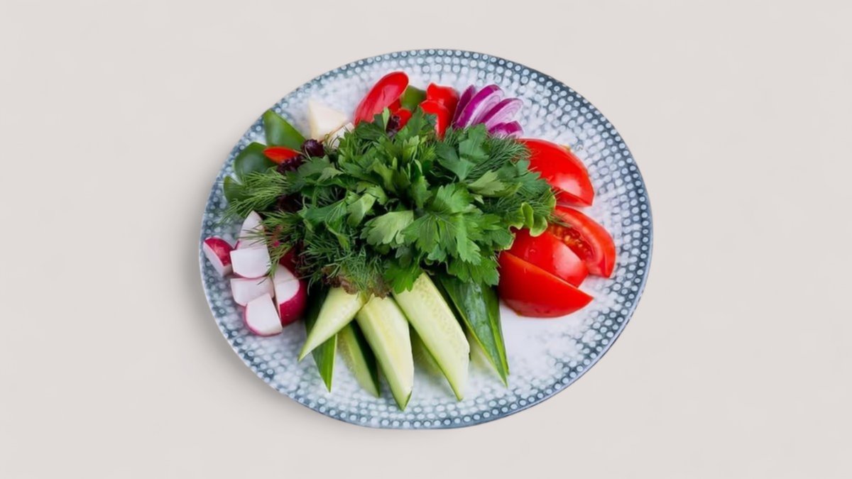 Помидоры, огурцы, перец болгарский, сыр Фета, микс салата, оливки, маслины, красный лук, фирменная заправка.