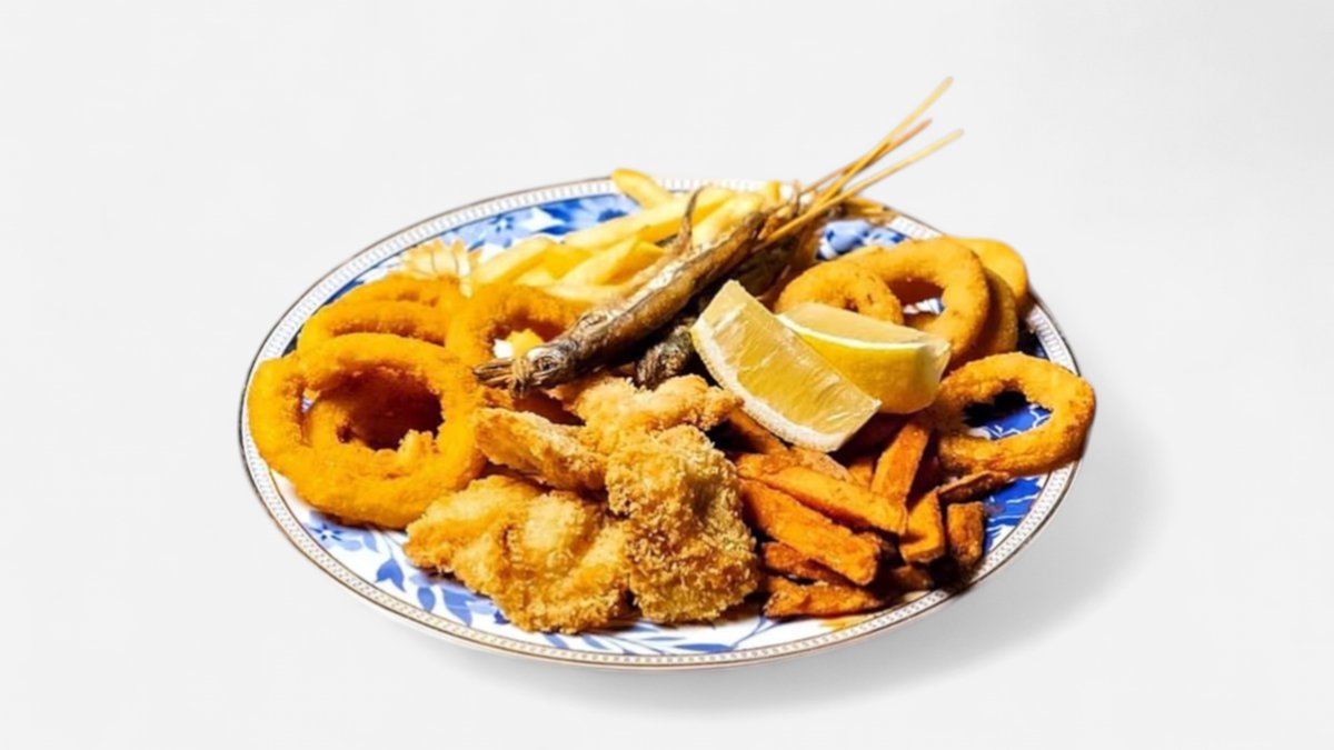 Креветки в панировке, батат, фри, кольца кальмара, мойва жареная, луковые кольца, соус греческий, луковые кольца, лимон