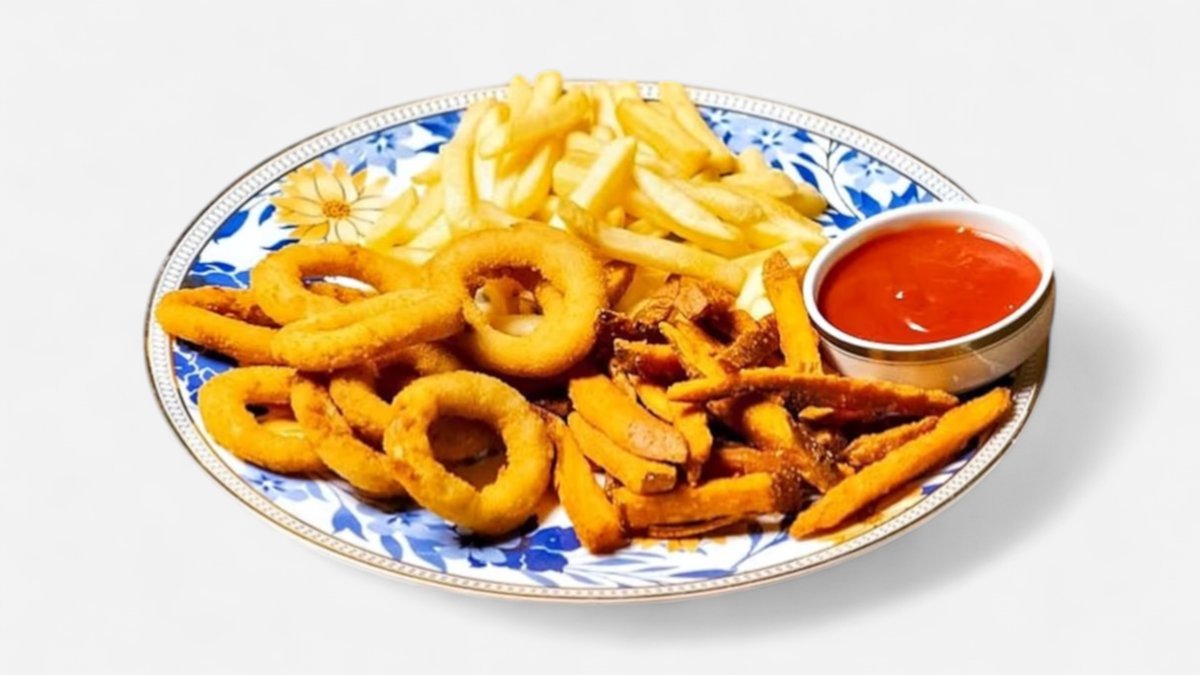 Картофель фри, батат фри, луковые кольца, кетчуп