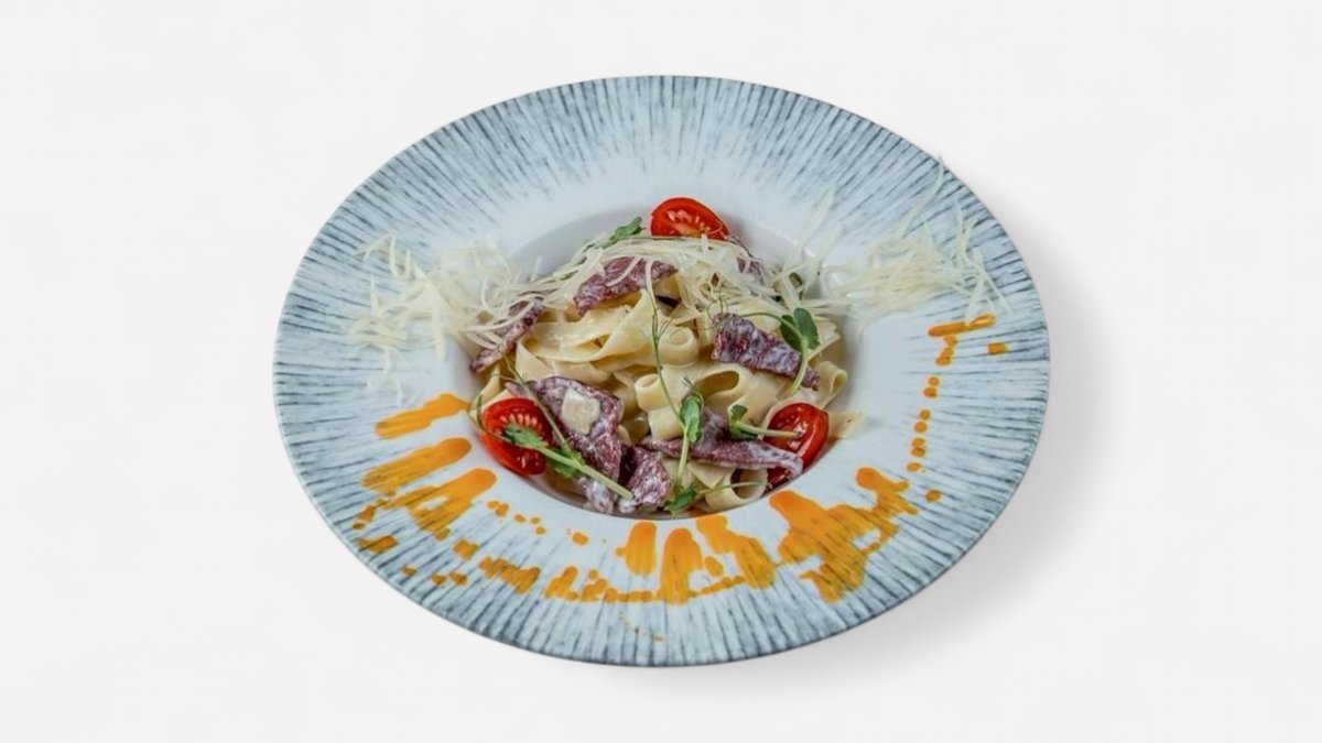 Говядина х/к, чеснок, масло оливковое, сливки, пармезан, желток, спагетти (в сумму включена стоимость за одноразовую посуду)