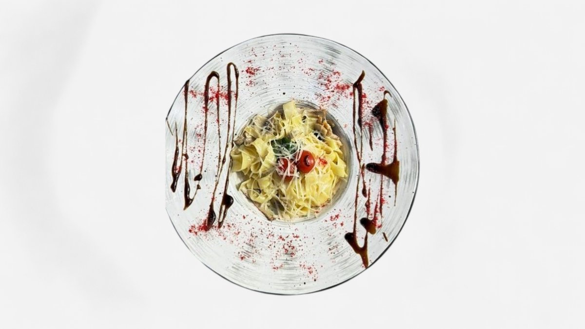 Куриное филе, грибы, фетучини, сливки, пармезан, масло оливковое (в сумму включена стоимость за одноразовую посуду)