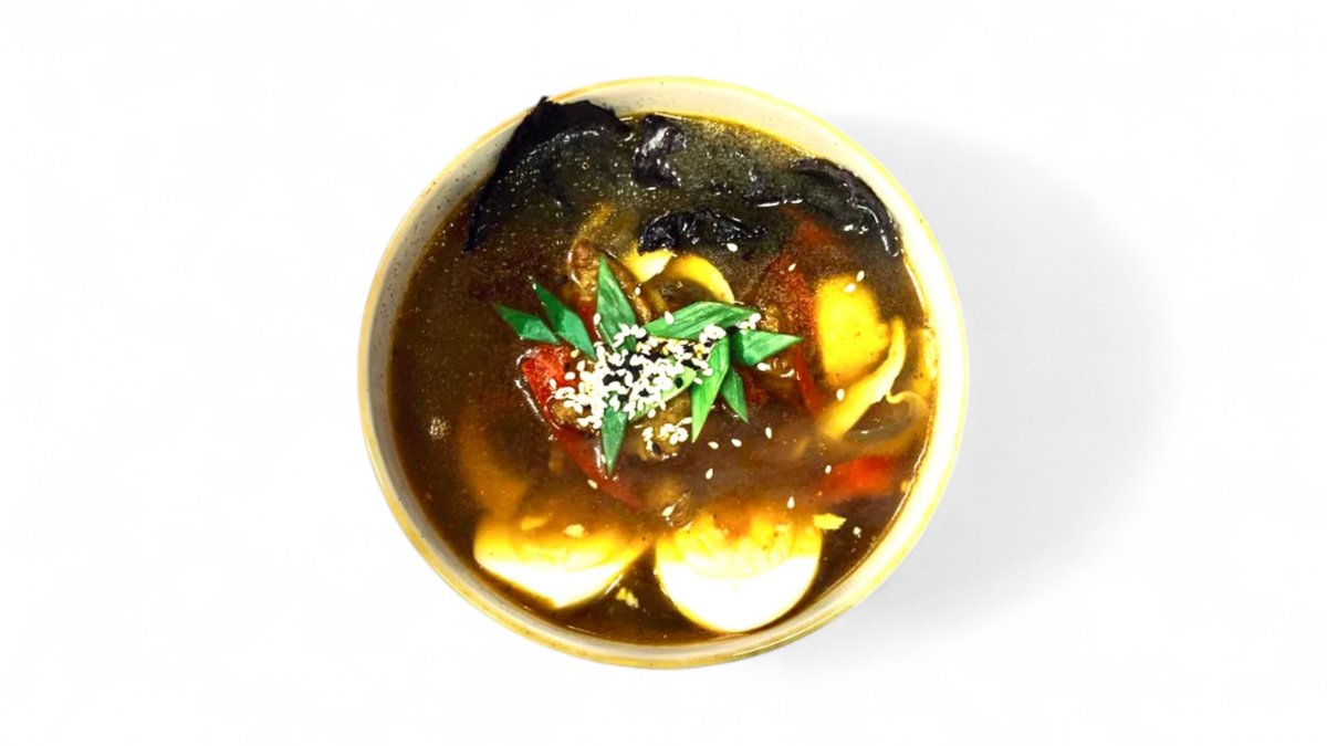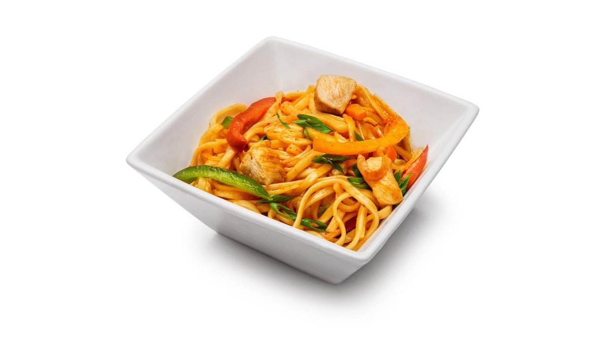 Курица,болгарский перец,грибы,водоросли,лапша,соевый соус (по остроте),куринные яйцо (в сумму включена стоимость за одноразовую посуду)