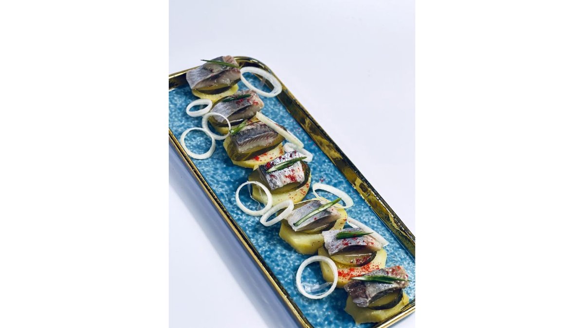 Селедь с\м,соленные огурцы,жареный картофель,квашенная капуста,лимон и маслины(в сумму включена стоимость за одноразовую посуду)