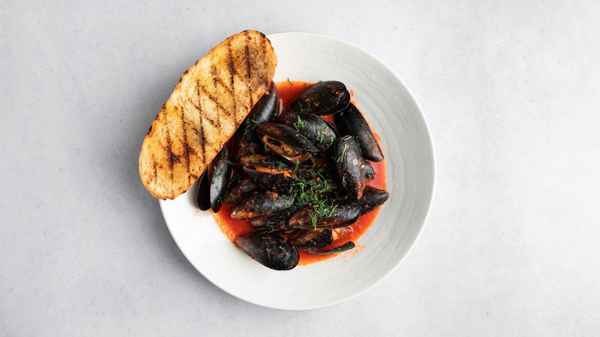 Мидии в томатно-сливочном соусе с чесночным хлебом 2шт(мидии) (в сумму включена стоимость за одноразовую посуду)