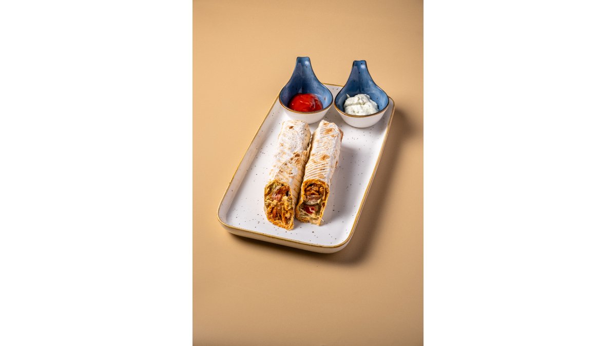 Лаваш, курочка, сыр моцарелла, шампиньон, опята маринованные, картофель фри, лист салата, фирменный белый и красный соус.