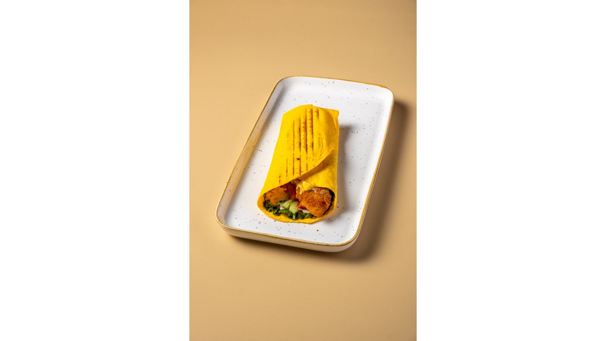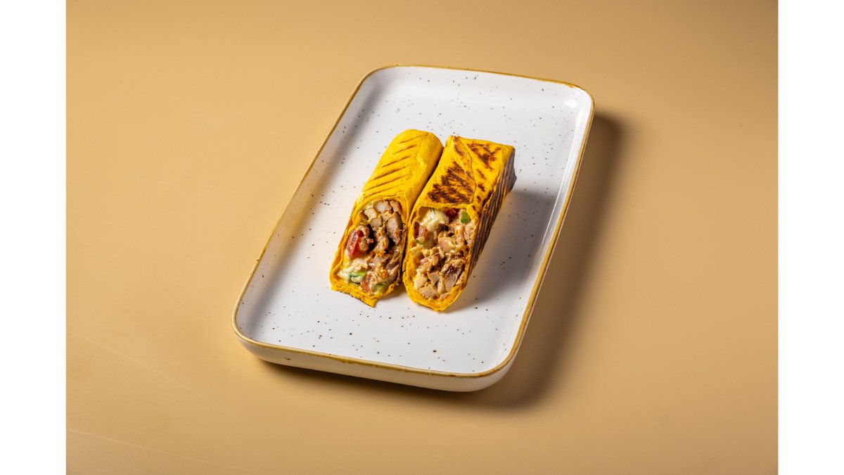 Сырная тортилья, курочка, помидоры, свежие огурцы, сыр сулугуни, фирменный белый соус, соус сырный, соус терияки.