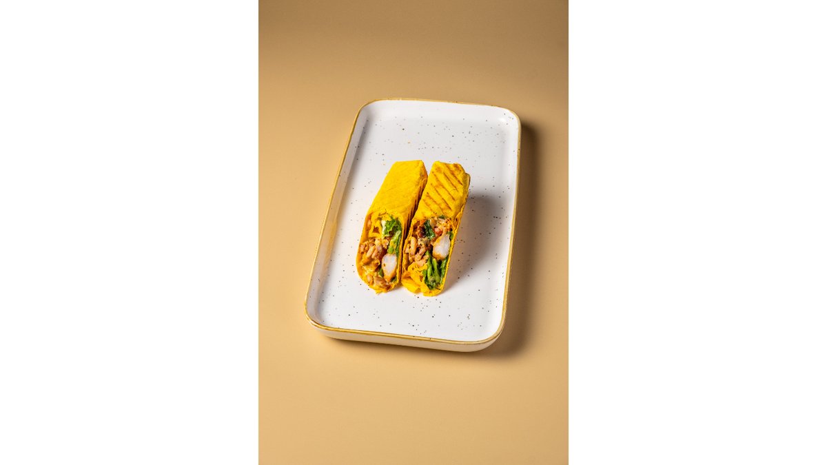 Сырная тортилья, курочка, креветки, лист салата, помидоры, свежие огурцы, лук жареный, опята маринованные, кольца кальмара, соус том-ям.