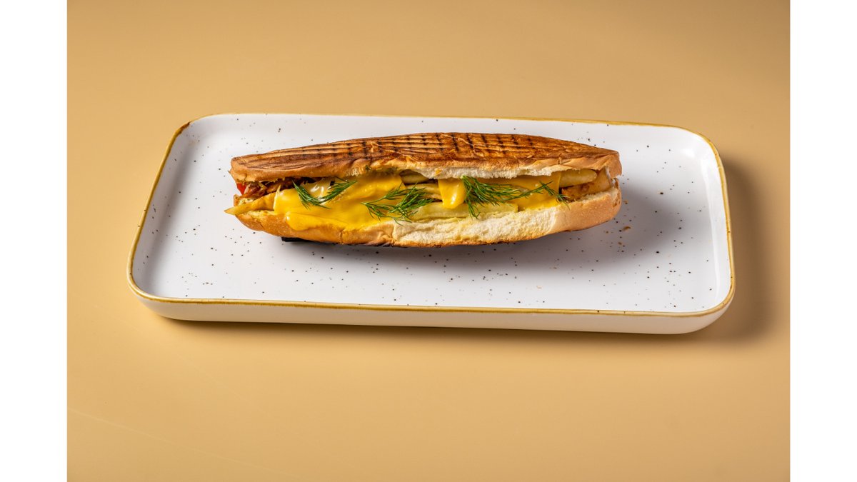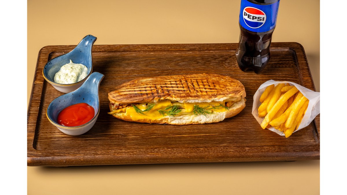 Булочка, курочка, помидоры, картофель фри, сыр сулугуни, маринованный огурчик, укроп, сыр чеддер, фирменный белый и красный соус.