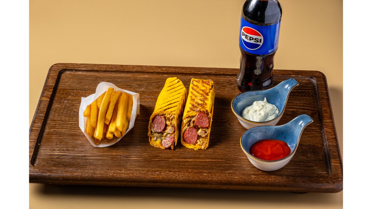Сырная тортилья, курочка, свежие огурцы, картофель фри, говяжья сосиска, фирменный белый соус и соус барбекю.