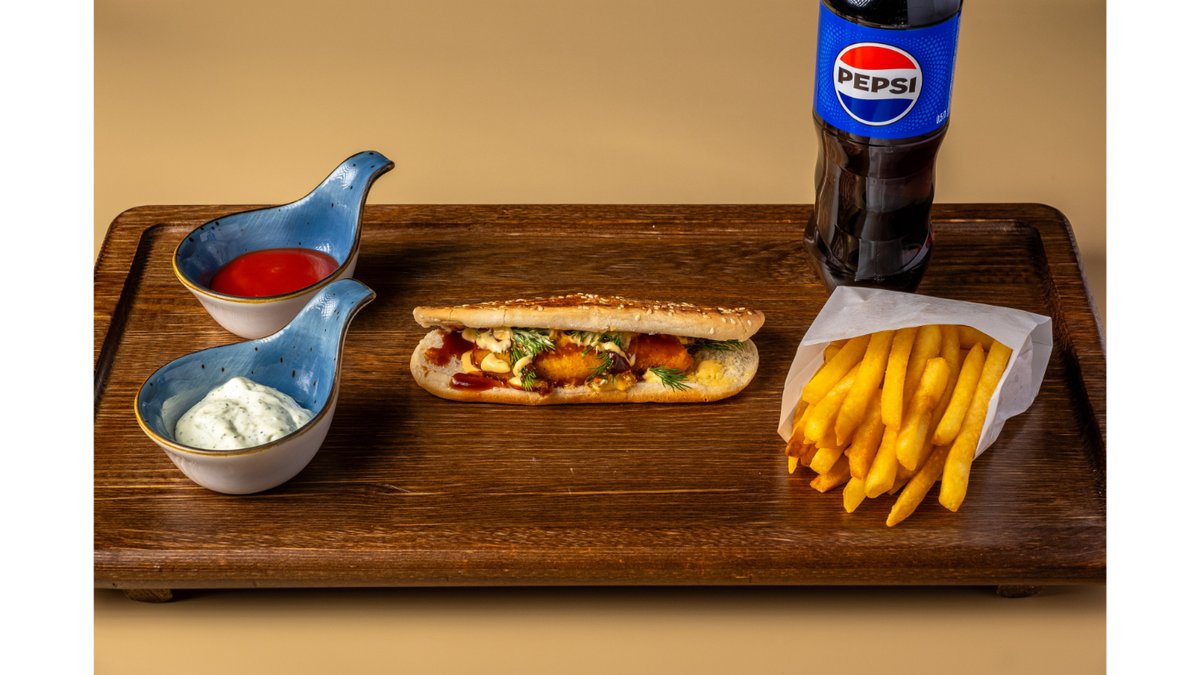 Ход-дог со стрипсами 1-шт, картофель фри - 1 порция стандарт, напиток - 500 мл